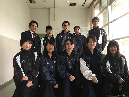 山鹿市総合体育館において全国選抜県大会が開催されました。男子は、1回戦八代清流高校に勝利、続く2回戦に人吉高校に先鋒が2本勝ちしたリードを守れずに逆転負けでした。15日(日)女子団体戦では、1回戦湧心館高校に快勝。2回戦は第4シード・前回優勝の尚絅高校に先鋒後藤が値千金の1本勝ち。この1本を次鋒から大将まで粘り強く、果敢に攻めながらも引き分けに持ち込み、見事な勝利を手にすることができました。続くベスト4をかけた試合では、必由館高校に惜敗しました。しかし、本校が高校総体ではベスト8のシード校となり、女子団体戦では、久しぶりの快挙です。今夏に向けて、さらに稽古に精進して参りたいと思います。