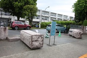 正門の大きな門柱は花崗岩でできています。今回の地震では、前震では倒れませんでしたが、本震で2つとも倒れてしましました。正門の車の出入りの妨げになっていますので、先日同窓会にお願いして門柱を移動していただきました。本校のシンボルの一つでありますが、元に戻るのには少し時間がかかると聞いています。