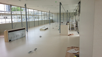 第1棟目の横に第2棟目のプレハブ教室が建築中です。ここは主に現在管理棟に入っている職員室、進路指導室、事務室、校長室などが入ります。また、図書館が使用不能となっていますので、図書の貸し出し、閲覧や学習するスペースを設けます。管理棟や図書館が生徒立ち入り禁止となっていますが、第2棟が完成することで、職員室にも生徒が自由に入れるようになりますし、十分とは言えませんが図書館の機能も復活することができます。