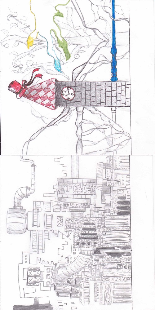 これはケント紙で作成し、画像処理ソフトで合成しました。制作・写真・画像編集と複数の学びをしました。