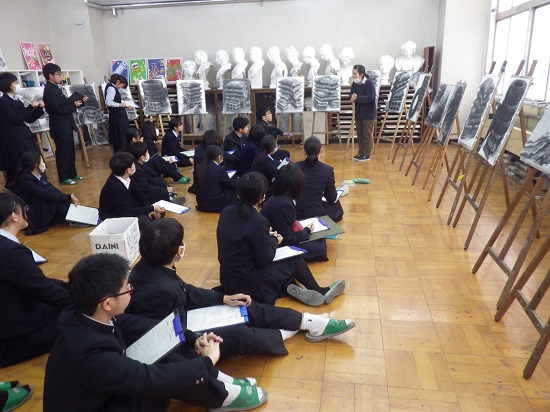1年生初めてのデッサンの講評が行われました。モチーフはブロックをTの字に組み合わせたもので、意外と難しいものです。先生方から丁寧に講評が行われ、お互いに講評し合う姿も見られました。次は初めての油彩画。楽しんで下さい。