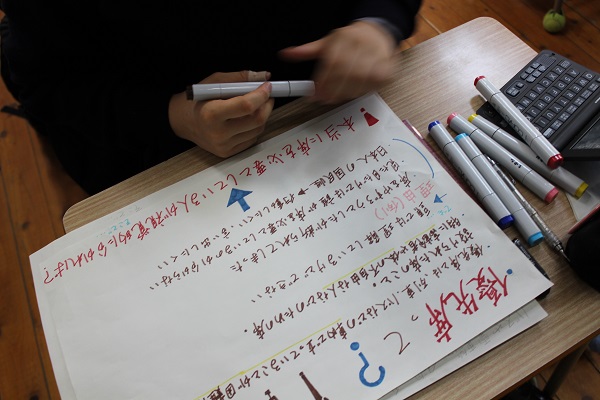 ▲実物投影機を使用しプレゼンしました。彼女は発表内容をKP法でまとめ、簡潔に内容をまとめました。
