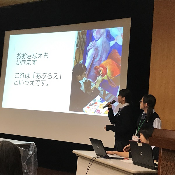 井上先生の講義では「素敵な誘導」という言葉で、ゲームやデザインを制作するプロセスにある「予測すること(テーマ研究でいう「仮説設定能力」)」の重要性と言語や非言語のコミュニケーションを活用し「人の行動を誘導する」方法についてレクチャーされました。美術科の生徒たちが日々励むデッサンも外国語の習得に匹敵する「コミュニケーション能力」の一つです。