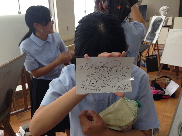本校美術科OBであり、くつだる。の原案、キャラクターデザインをされている、ゴトウマサフミさんが来校されました。生徒達にキャラクターを描いてくださり、皆大喜びです!ありがとうございました!!
