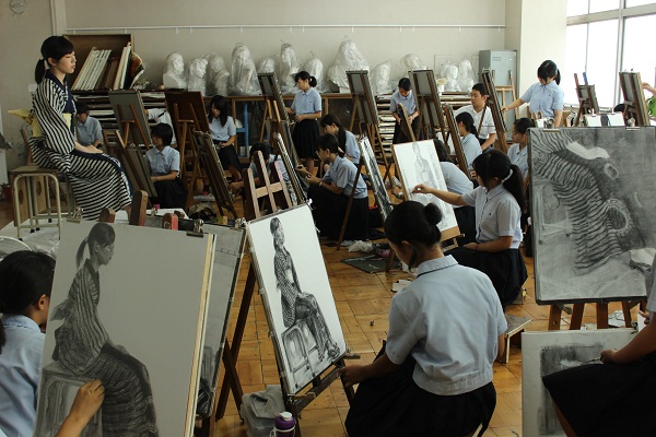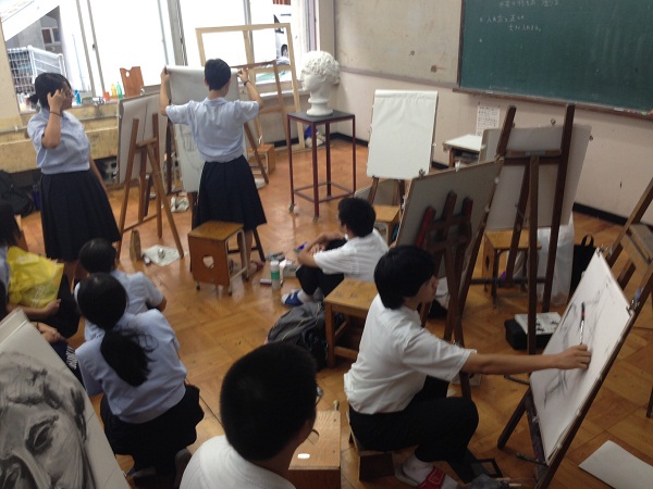 1年生にとって初めての石膏デッサンが始りました。そして、放課後、3年生4人にデモンストレーションを行ってもらいました。公開制作を皆が見ている前でするのです。本校美術科だからこそできることではないでしょうか。3年生のデッサンに後輩達は見入っていました。最高の学びとなったのではないでしょうか。