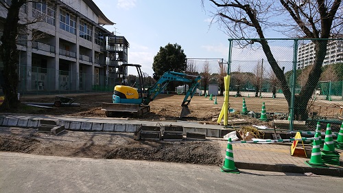 1月7日から、仮設校舎としてハンドボールコートに建設されていたプレハブの撤去工事が始まっています。熊本地震後、主に1年生の教室として使用し、その後、図書閲覧室や進路資料室として活用しました。3月末までには仮設管理棟として使用したプレハブも撤去され、ハンドボールコートへの復元工事が始まります。