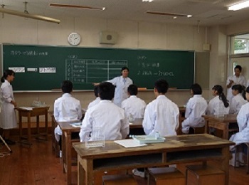 中学生には希望した学科に分かれてもらい、最初に各教室でプロジェクタを用いて、「生徒会長挨拶」、放送部が作成した「学校紹介」、理数科・美術科2年生が作成した「学科紹介」を映像で見てもらいました。その後、普通科では在校生との交流会、理数科では課題研究の紹介及び実験体験、美術科ではデッサン実技が行われました。