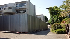また、教室棟と特別教室棟を結ぶ渡り廊下の撤去作業の準備が始まりました。渡り廊下に足場が組まれ、教室棟北側と特別教室棟の間は金属製の板で囲まれて立入禁止です。
