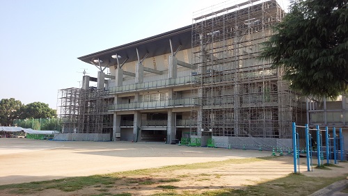 体育館改修のため、テニスコートに続いてグラウンドにも足場が組まれています。屋根を修理する機材を載せるためです。体育館は来年1月末に工事が完了する予定です。