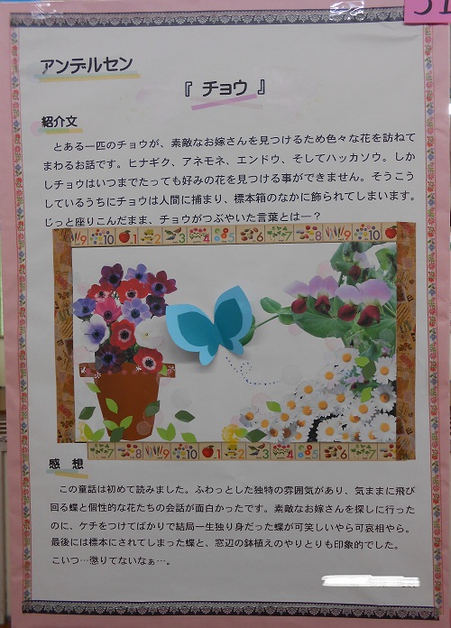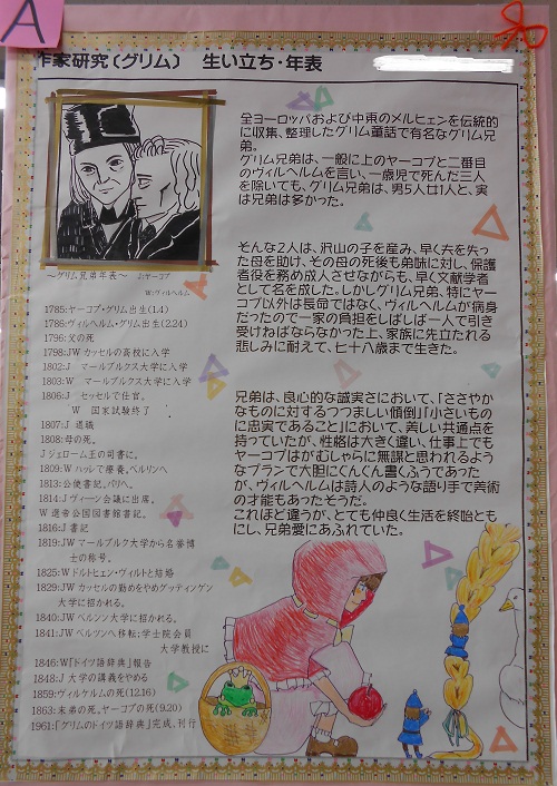 今年度のテーマは「童話」です。グリム・イソップ・アンデルセンの童話の中から、35作品を選び図書委員が一人一枚の紹介パネルを作成しました。また、今回は作家研究にも取り組み作家紹介パネルも作成しました。