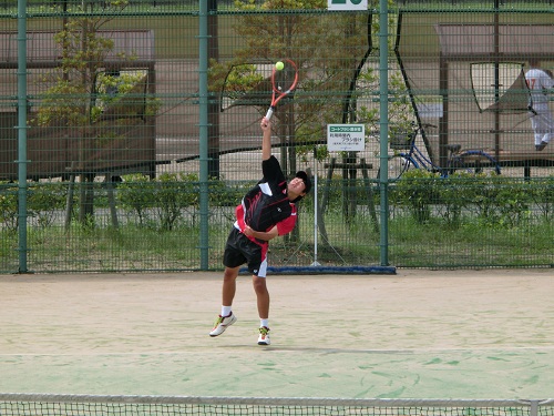 試合序盤は互いにサービスをブレークする展開でしたが、第5ゲームで相手がサービスをキープし、一気に流れを持って行かれました。2-5ダウンとなり、「昨日の二の舞か!」と思っていたら、ストロークでの攻めと守りのメリハリが出て、なおチャンスボールを積極的に前に出て打ち込み、逆転に成功しました。結果は、8-6の勝利です。前日からの作戦が機能したことと、何よりも本人の気持ちが切れずに最後まで攻め抜いたことが勝因です。