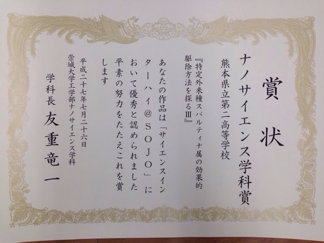 九州工業大学主催のサマーサイエンスフェスタin北九州に生物部、物理部、2年生理数科課題研究班が参加しました。4件の研究発表を行い、その中で生物部が優秀賞をいただきました。生物部のみなさんおめでとうございました。
