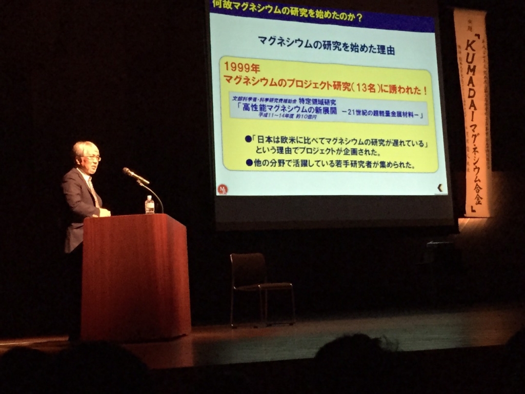 講師は熊本大学先進マグネシウム国際研究センター長の河村能人教授で、「KUMADAIマグネシウム合金」の演題でご講演いただきました。国際的に優れた業績を上げられている研究者の話は、説得力があり難しい研究も分かりやすく説明してくださいました。