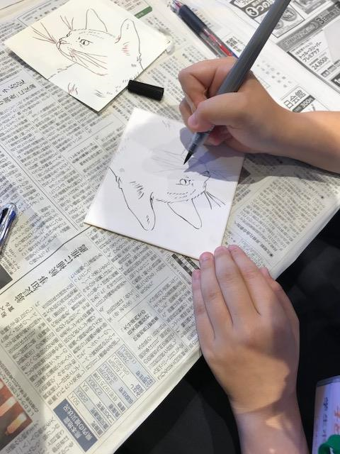 今回はフジタの作品の下地と墨で描かれた線に注目した内容でした。フジタの作品の特徴は肌などに使用される乳白色です。学芸員さんの解説によると、その方法はフジタの生前は極秘だったそうですが、没後の研究によって明らかになりました。ベビーパウダーや様々な素材を使用したそうですが、今回は少しでもそのエッセンスを味わうために胡粉ジェッソという下地材を色紙に塗り、筆ペンで描写しました。