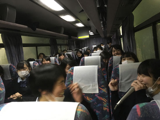 7時間のバス移動でも・・・クラス毎にカラオケ大会やビンゴ大会が始まる。