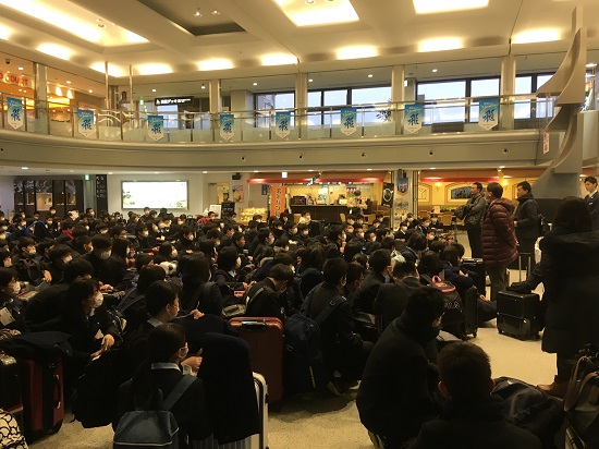 1年修学旅行団は、無事羽田空港に到着しました。本日(1月23日)に予定されていました「東京お台場周辺散策」は、降雪による道路事情の悪化により中止し、修学旅行団は宿舎(グリーンプラザ軽井沢)に向かいます。