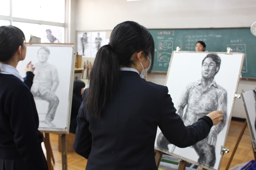 6月は初めての石膏デッサンです。1年生は毎年「ラボルト」という石膏像を描いています。昨年の地震で被害を受けた石膏像ですが、美術科卒業生の皆さんからの援助でこうやって授業を行うことができています。