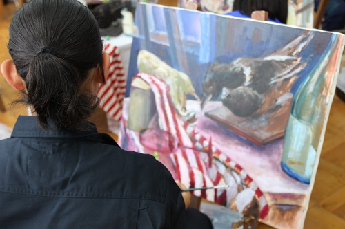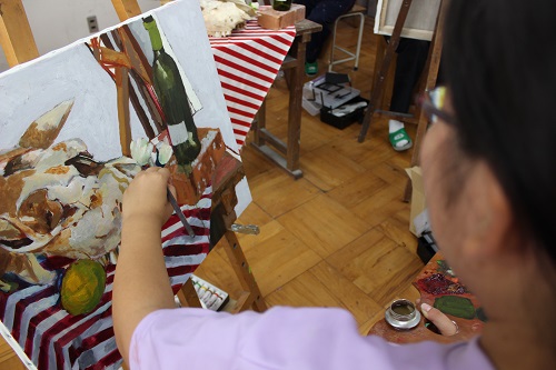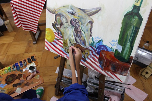 7月はグループでモチーフを組み、油絵を描きます。オイルの独特の匂いに辛そうにしたり、スカートを絵の具まみれにしたり、悪戦苦闘していました。色を重ねていく毎に油彩独特の宝石のような色彩が現れてきます。締切は7月19日、時間いっぱい作品と格闘してくださいね。