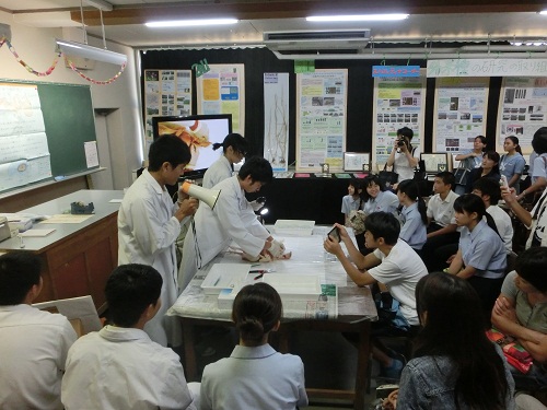 生物部の展示も大盛況で、ニワトリの解剖には多くの人が詰めかけました。葉脈標本のしおり作製やウミホタルの発光実験などの体験コーナーも好評でした。小学生や中学生もたくさん訪れ、楽しんでいました。