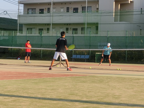 17日は、9:00~13:00まで練習です。前日に引き続きストローク練習中心でしたが、後半はスマッシュやボレーなどネットプレーの練習でした。チャンスボールの処理は力んでミスが目立ちましたが、ドライブボレーは思いのほか足が良く動き、いいショットが打てました。