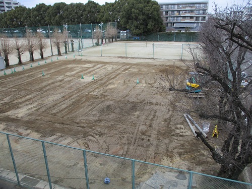 一昨年の地震以来、使用できなかった体育館の改修工事が終了し、もうすぐ授業や学校行事、部活動で利用することができるようになります。テニスコートも体育館の工事に伴い、昨年7月以来使用できず、練習会場の確保で不自由な思いをしました。ようやくテニスコートの復旧工事が始まりました。4月に入学する新入生は新しいコートで練習できる予定です。