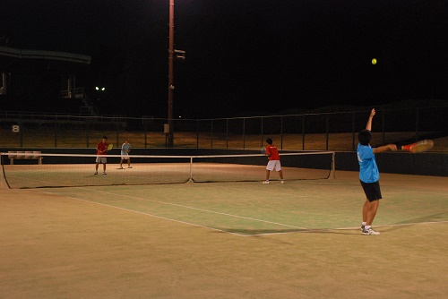 毎年のことですが、大会前にはOBが練習の相手をしてくれます。今日は、熊本大学に通う48期生の木下先輩と今年3月に卒業した52期生の宇佐美先輩が駆けつけて、現役生を指導していただきました。2人とも大学でテニスを続けていることもあり、現役時代以上のプレーで多くのことを学びました。特にシングルスの相手をしていただいた木下先輩のパワーとスタミナには脱帽しました。最後は中村主将がインターハイ出場を誓って先輩にお礼を言いました。