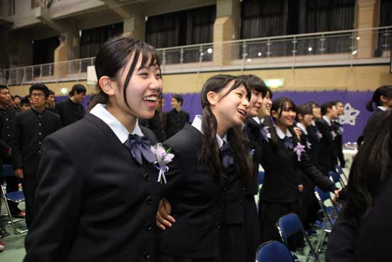 第54回卒業証書授与式 投稿日時 : 2018/03/01 職員 カテゴリ:校内行事 3月1日(木)第54回卒業証書授与式が挙行されました。2年ぶりに本校体育館で卒業式が行われ、普通科322人、理数科41人、美術科39人が母校を巣立ちました。最後は式典リーダーの指揮のもと三綱領唱和を行い、皆で肩を組んで生徒歌を歌いました。思い出に残る、感動的な卒業式となりました。