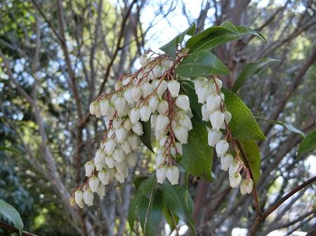 第二高校バス停の横にアセビの花が満開です。枝先に10cm程度の花序を垂らし、多くの白いつぼ状の花を咲かせています。一見地味ですが、一つ一つの花を観察すると10本のおしべなどを確認することができます。