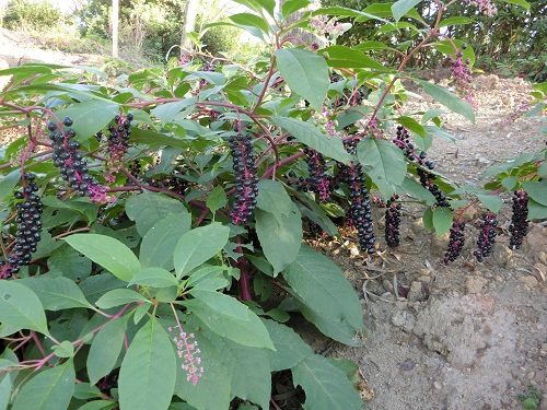 ヨウシュヤマゴボウ(学名:Phytolacca americana)は、ヤマゴボウ科ヤマゴボウ属の多年草で、別名アメリカヤマゴボウといいます。この植物の特徴と言えば、何といっても濃紫色の果実でしょう。真夏に白色または薄紅色の花を咲かせ、この時期果実は黒く熟します。潰すと赤紫色の果汁が出てきて、染料として用いられることもあるようです。皮膚や服に付くと色が落ちないので、アメリカではインクベリー(inkberry)とも呼ばれているようです。