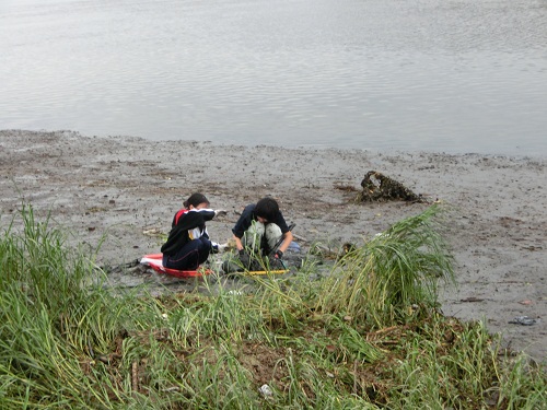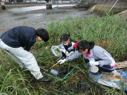 第二高校生物部は、3年前から外来植物であるスパルティナ属の調査研究を行っています。熊本県のスパルティナ属は、坪井川や白川(熊本市)、大野川、砂川(宇城市)に見られ、本校生物部は坪井川河口の干潟を調査対象として、駆除方法や環境への影響を研究しています。