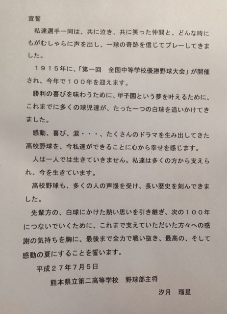 高校野球にかける熱い思いが伝わる、感動的な宣誓でした。