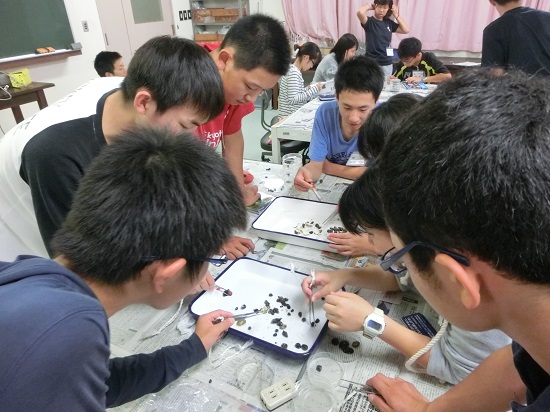 講師の新垣先生と一緒に集合写真 九州大学臨海実験所にて