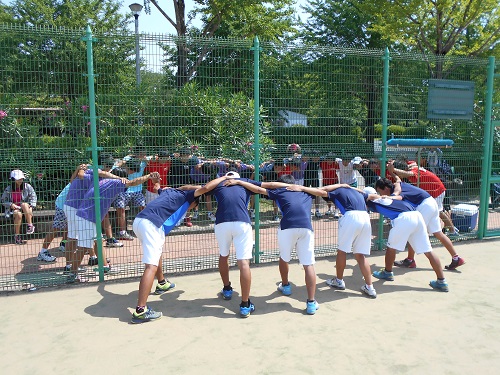 6月3二日は団体戦、いつも通りに7時から練習を行い、最後の調整を行いました。初戦の文徳高校高校戦は団体戦の雰囲気に呑まれ、劣勢での展開でしたが、その状況を打破したのが、主将の松本くんの気迫あふれるプレーでした。キャプテンの気迫に後押しされて下級生のダブルスも劣勢から追いつき、副主将の坂本くんが粘り強いプレーで勝利し、接戦を制しました。