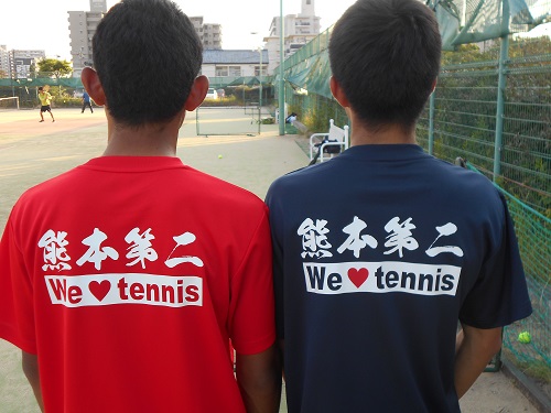 第二高校テニス部は、毎年練習及び応援用にTシャツを作成しています。今年は例年になくいいものができました。Tシャツの背中には『熊本第二 We love tennis』、左胸には『熊本第二 庭球部』と書いてあります。Tシャツの色は赤と紺で、文字が白です。赤がメインで紺がサブとして作りましたが、どうも紺の方が評判がいいようです。高校総体では、このTシャツで選手を後押しします。