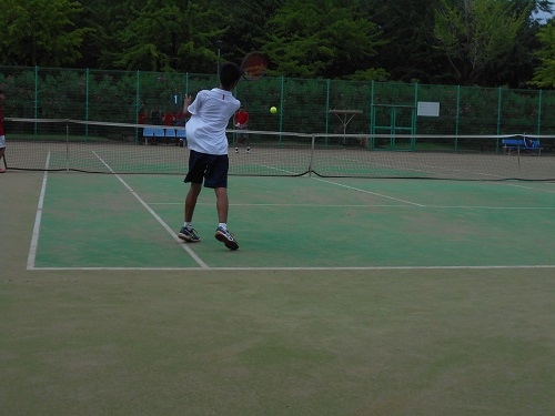 一方、屋外で行われた男子は、早朝からの豪雨で試合開始が1時間程度遅れました。1年生は初めての試合ということもあり、コート上での硬さが感じられました。足が止まって、上体だけでストロークを打ち、序盤はミスを繰り返しました。しかし、試合の雰囲気に慣れるにつれ、普段の練習のようなストロークが見られるようになりました。練習試合を含め、新チームの練習量は例年以上です。自信を持ってプレーすれば必ず結果はついてきます。