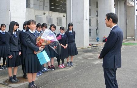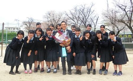 テニス部では、顧問の山﨑先生が第二高校を御転出されることになり、転退任式後にテニスコートでお別れをしました。山﨑先生は主に女子の指導を中心に試合や練習試合の引率をしていただきました。女子キャプテンからお礼の言葉があり、次の高校総体での決意が述べられました。そして山﨑先生からは、「楽しんでテニスをすること、そして高校総体ので活躍を応援します」とエールが送られました。