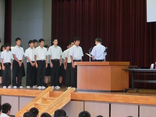 表彰式後には今夏全国大会に出場する部活動の壮行会がありました。今回、第二高校からは51人の生徒が全国大会に出場します。テニス部男子からは、団体と個人に5人が出場します。壮行会では、那須校長先生、そして木下同窓会長から激励の言葉があり、その後テニス部主将の宇佐美(3年)くんが出場生徒を代表して誓いの言葉を述べました。誓いの言葉の全文は次の通りです。