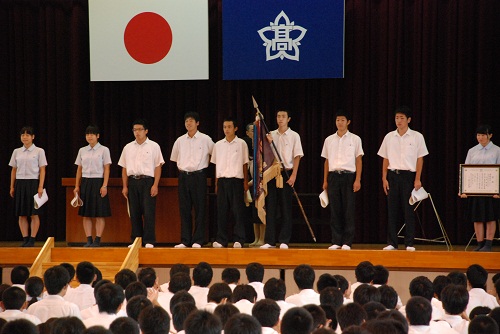 7月17日、今日は1学期の終業式です。式に先立って、表彰式と全国大会の壮行会がありました。表彰式では、高校総体の団体優勝をはじめ、個人戦で活躍した木村(2年)くんと松本(3年)くんが一番に表彰されました。