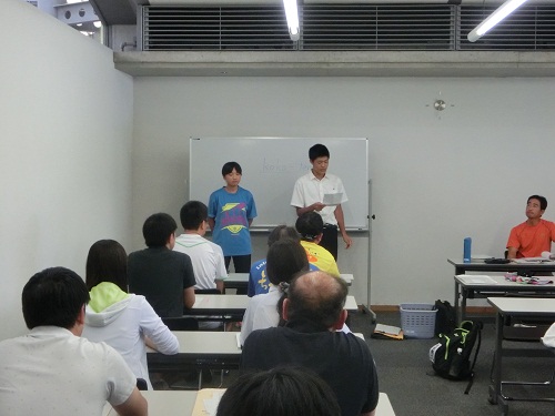 パークドームで行われた監督会議の冒頭で、出場した選手の代表によるインターハイの報告がありました。本校からは男子代表として、主将の宇佐美選手がインターハイで感じたことを詳細に報告をしました。
