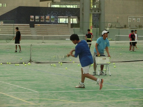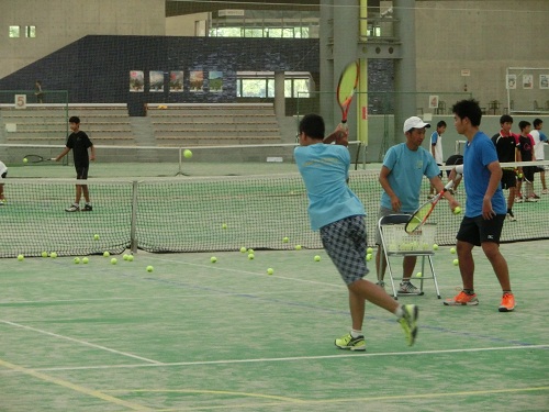 練習内容は、準備運動からはじまり、ストローク中心のものでした。準備運動に1時間以上の時間を割き、その後はストロークの基本練習を繰り返しました。1年生にとっては、基本の反復練習で大変有意義な者だったと思います。13:30~16:30までみっちりテニス漬けの3時間でした。