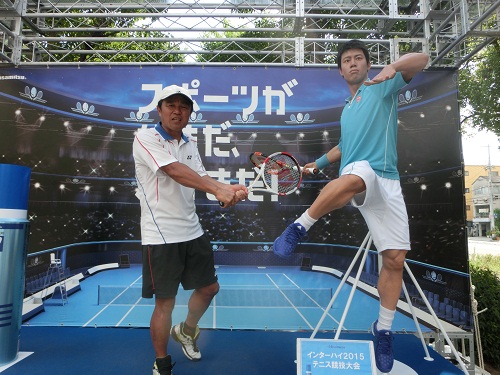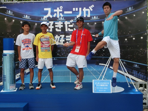 テニス会場の前には、錦織圭の等身大モデルが設置され、記念撮影ができるようになっていました。最近は錦織圭の活躍もあり、テニスの知名度が上がり、競技人口も増加の傾向にあります。選手も例外なく、錦織圭のモデルと一緒に記念撮影を行いました。