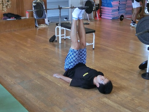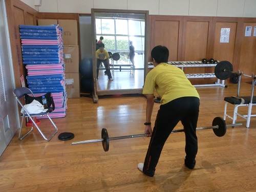 控えメンバーがコートで練習する一方で、団体メンバー9人は隣接するトレーニングルームでウエイトトレーニングに汗を流しました。トレーナーの指導で、本格的な筋トレに取り組んでいます。トレーナーから様々なトレーニングメニューを指導していただき、選手はメニューをこなすことで精一杯です。見た目以上にハードな練習メニューで、春には筋力アップ間違いなしです。