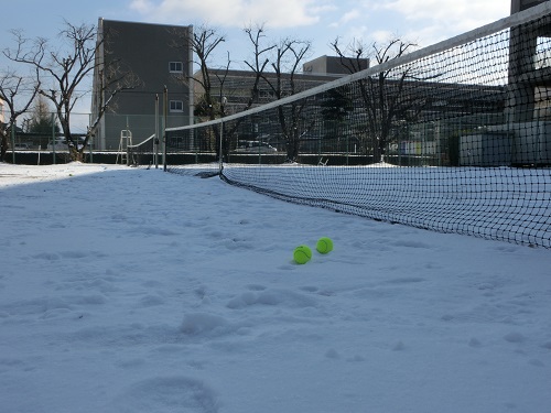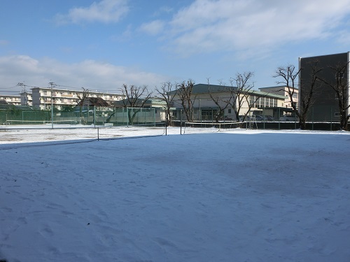 24日の日中から降り続いた雪で、グランドは一面の雪景色となりました。熊本市内では最近見ることのない光景が広がっています。もちろんテニスコートも一面雪に覆われ、練習どころではありません。25日は、太陽も顔を出し、白い雪と青い空のコントラストが雪国を思わせるようです。