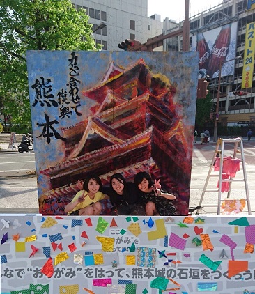 平成30年4月14日(土)~15日(日)に花畑公園で行われた防災食フェアにて、美術科の生徒がライブペインティングを行いました。画面には「力を合わせて復興 熊本」の文字と、熊本城の雄姿を描きました。