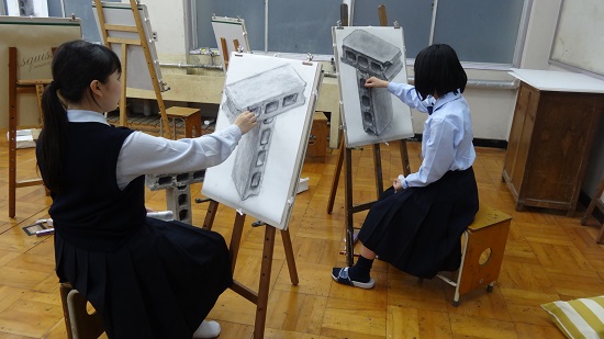 初めてのデッサンは「T字ブロック」。木炭で描くことも初めてという生徒も多く「思うように描けない!!」「鉛筆がいい!」と言っていましたが、今では「木炭のほうが馴染む…」と言うまでに。