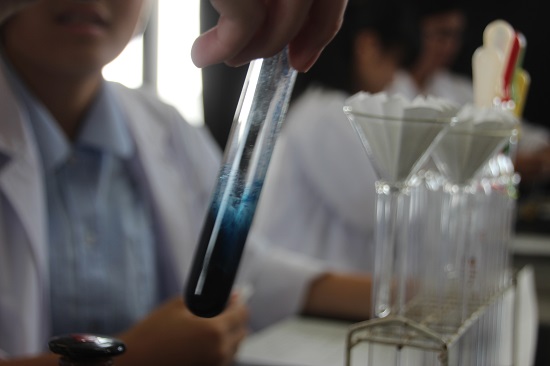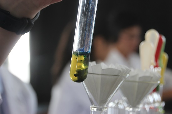 7月19日(木)、美術科1年生を対象に今年も絵の具をつくる実験を行いました。昨年度はこの授業を経て、九州国立博物館バックヤードツアーやAS(学校設定科目アートサイエンス)のテーマ研究において、絵の具をつくる実験を行ったチームが複数出るなど、美術探究とASの核となる事業となりました。