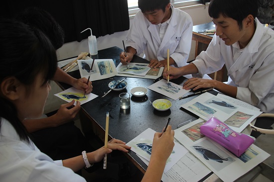 最後はみんなで、江戸時代ベロ藍と呼ばれたプルシアンブルーを用いた葛飾北斎と伊藤若冲の作品の模写、オマージュの制作。