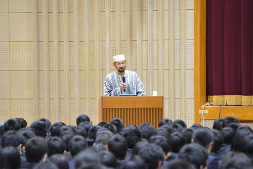 11日(金)、「夢に向かって!今、あなたのできること」~自転車世界一周から学んだこと~と題して、株式会社ミキハウスの坂本 達さんに大阪からお越しいただきました。せっかくの熊本を味わっていただこうと、職員手作りの郷土料理「だご汁、高菜めし、辛子レンコン、一文字のぐるぐる」を召し上がって頂きました。『アツイおもてなしに涙が出た』(初めての辛子レンコンがとても辛かったようです)とおっしゃりながら、進行の放送部員とも気さくに打ち合わせをしていただきました。