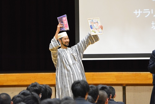 ギニアの民族衣装で登場していただいたあとは、3・11の黙祷を一緒に捧げました。坂本さんは、東日本大震災の支援をされており、震災以降一度も運動会ができない小学校がある現状も伝えてくださいました。