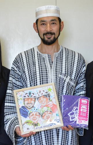 坂本さんへの感謝の気持ちを込めて、2年A組(美術科)の嶋田凪紗さんが坂本さんファミリーの似顔絵を描いてくれ、第二高校のネックタオルと一緒にプレゼントしました。持ち味を活かしたこのプレゼントをとても喜んでくださいました。